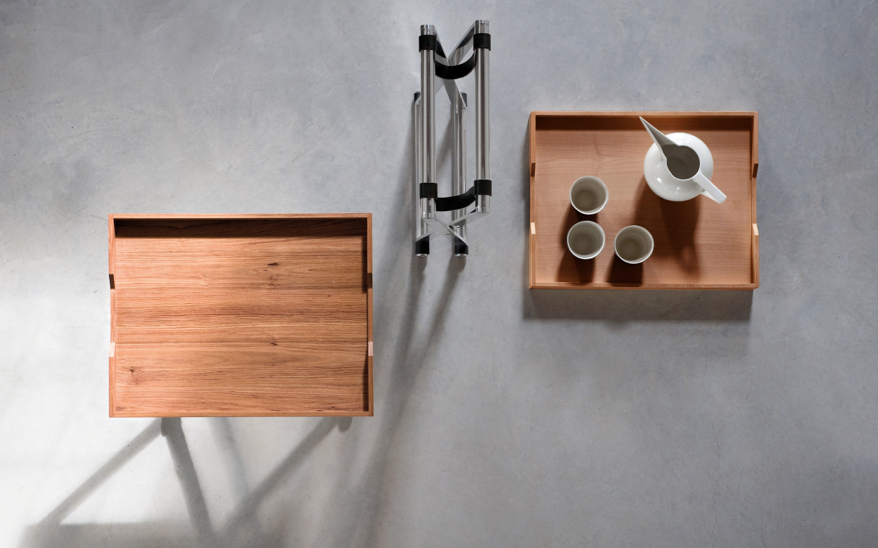 Andrea+ is a nomadic side table, a perfect complement for the REGISTA Chair line. The trays for this foldable side table are in black walnut wood. The X structure is light and durable , in brushed polished aluminium, anticorodal treated. Stainless steel joints and leather rings to cover the feet, hand sewn. The ANDREA stool can be folded with one single gesture to be stored in a small place when not used.
